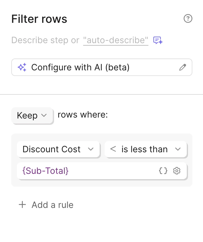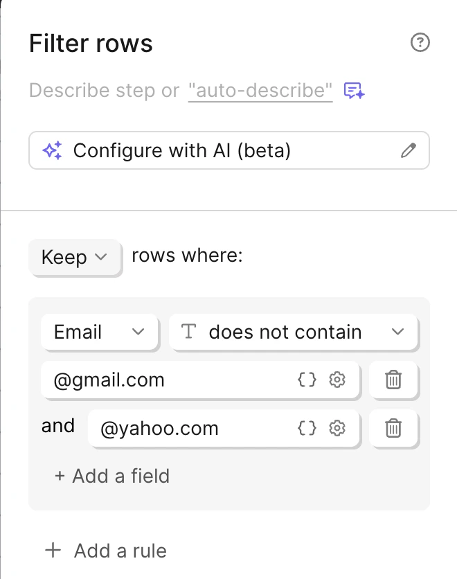 By default, this step will keep rows only if they follow any of the rules. This means that if a row satisfies one of the rules, that row will be kept. You can change this to keep rows only if they match all of the rules by clicking ’+ Add a rule set’ and changing ‘OR’ to ‘AND’ between them.