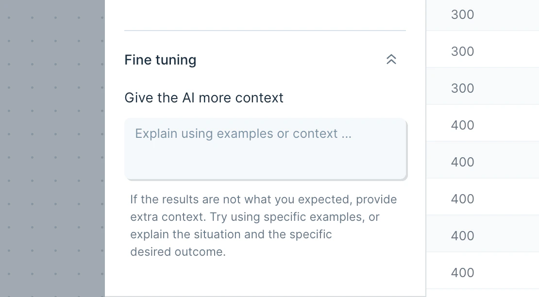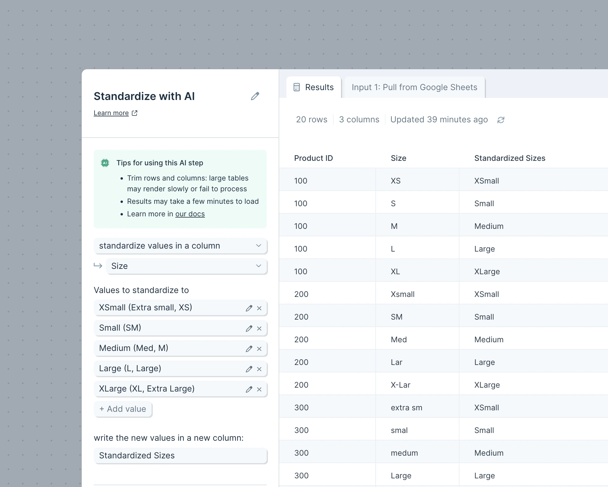 - Standardize values in a column: The AI will clean values in a specific column using examples that you provide as a guide. The cleaned values will be displayed in a new column, next to the column that the AI evaluated