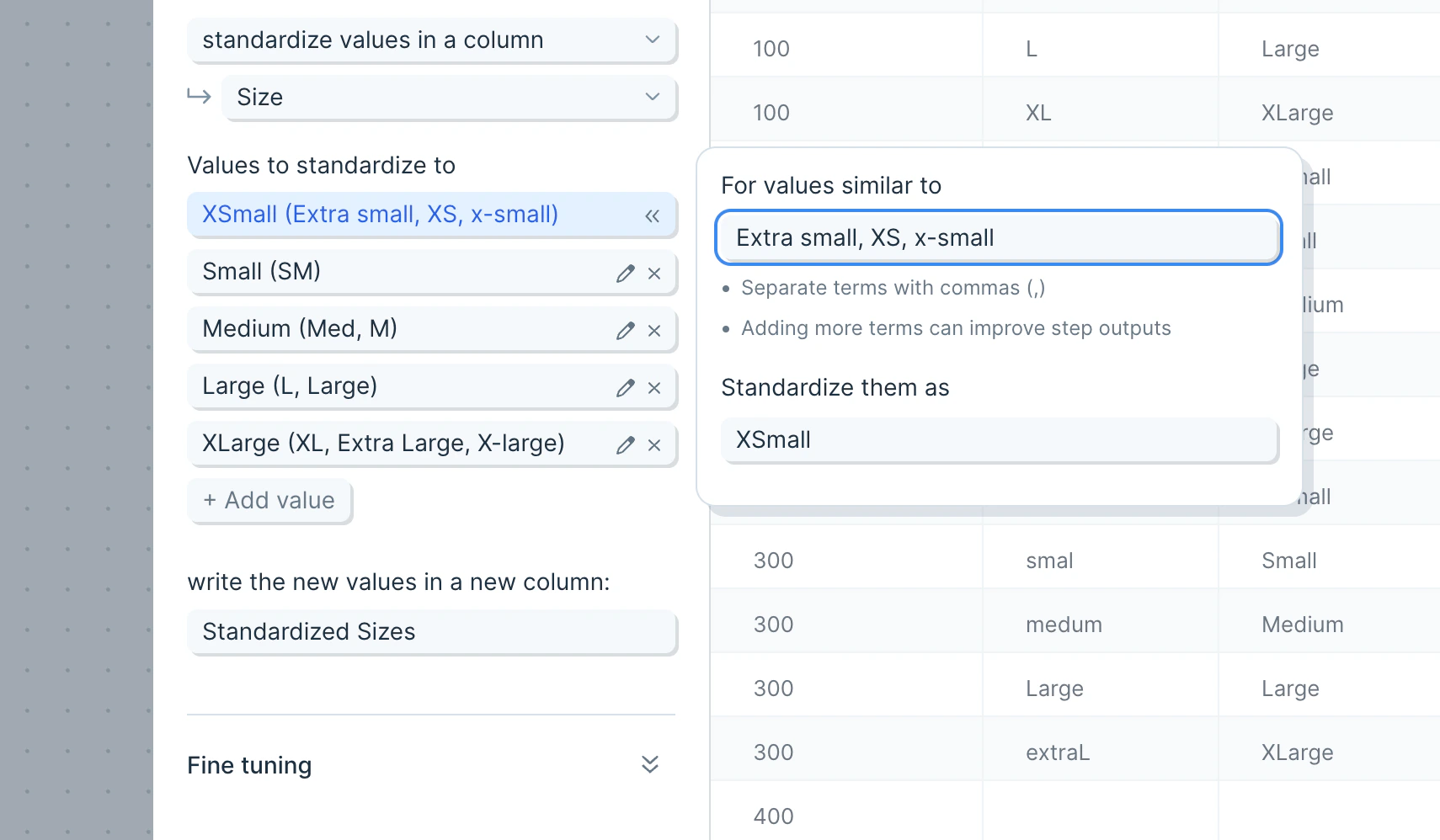 This step is designed to use examples to guide the AI to find values or column names to update. The better the examples, the better the AI will be at evaluating and standardizing your data. When evaluating a value, the AI will use the examples, as well as the desired new value, to make decisions. It will also infer and guess at names that you may not have given an example for. Include as many examples in each value as you would like, and separate them with commas. Each “Value” in the step settings should correspond to a single new value that you want to use as a column name or a cell value.Fine tuning