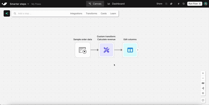 We’ve completely redesigned how steps and cards are added to Flows! Using the new builder toolbar at the top of your Flows, access any integration, transform, or card template for easy building.