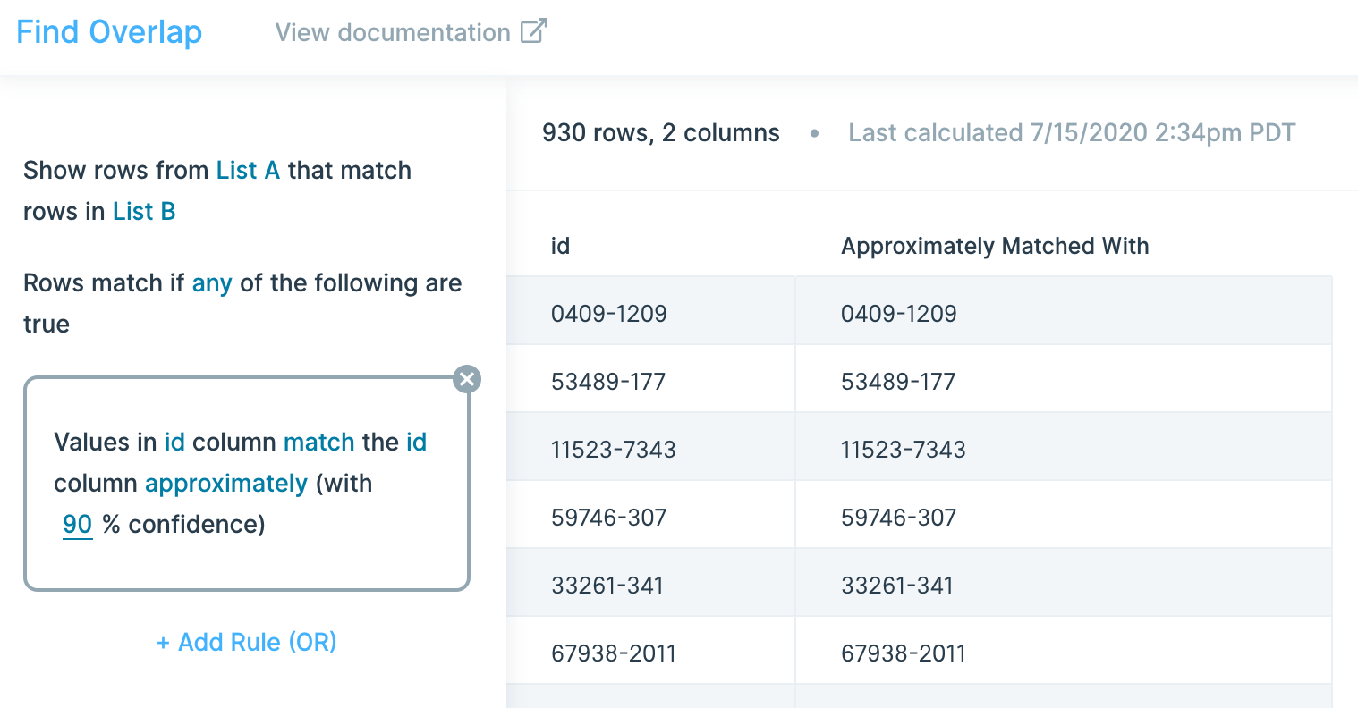 The Find overlap step improves upon our old List Contains step with new, streamlined settings that make it even easier to compare one table to another and show you the rows that match, or those that don't. You can even match based upon case-sensitivity or approximate matching.